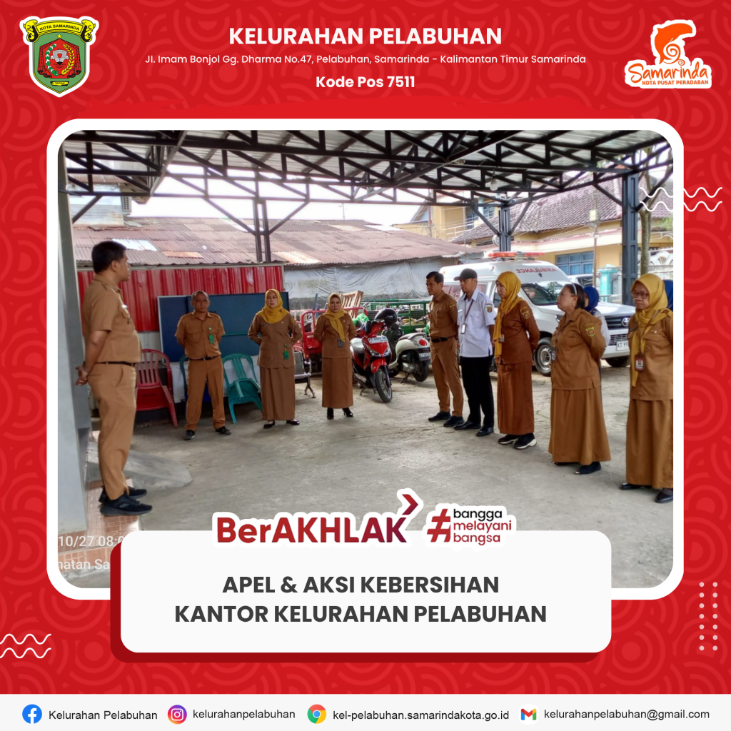 Setelah apel pagi, Seluruh staff Kelurahan Pelabuhan Kota Samarinda, di 30 menit pertama untuk melakukan aksi kebersihan kantor halaman, meja kerja, ruang kerja masing masing dan menyortir arsip arsip yang tidak dipakai, Sesuai dengan arahan Wali Kota Samarinda.