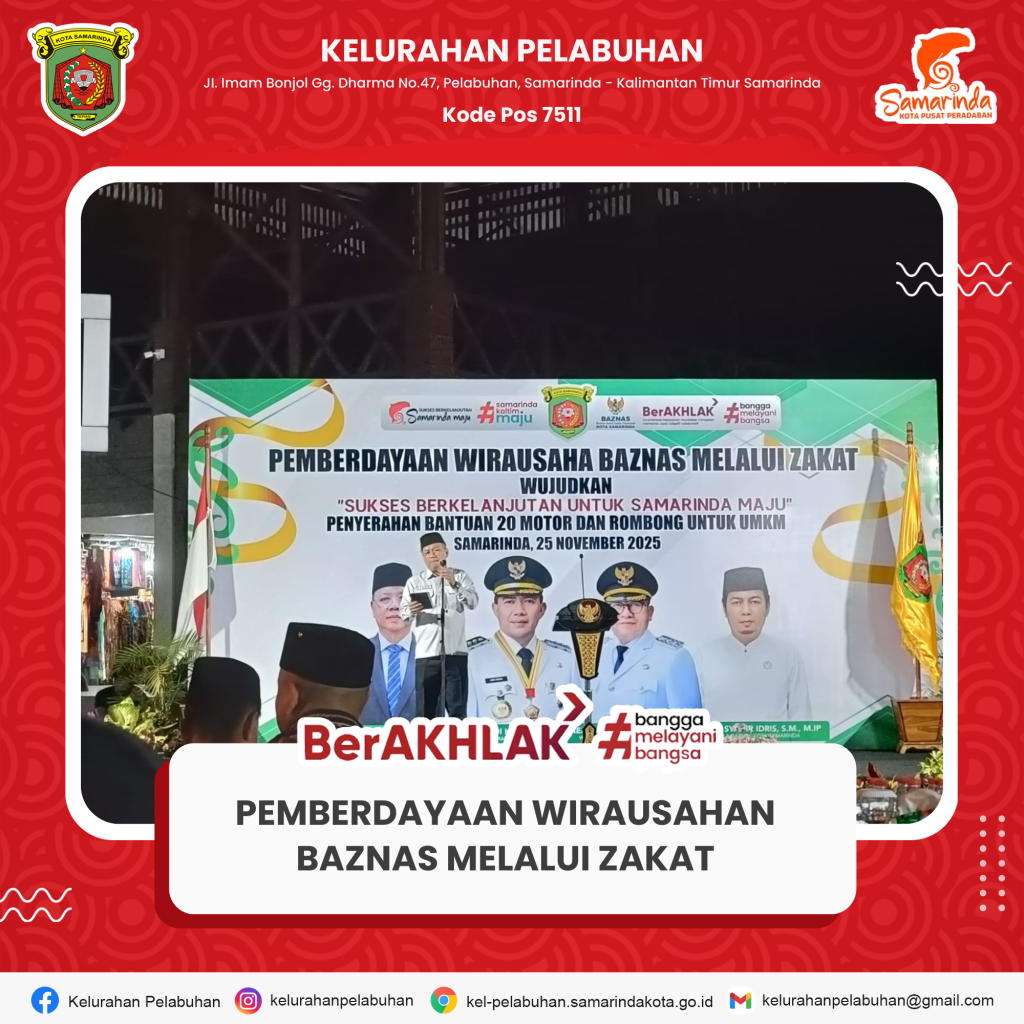 Lurah Pelabuhan menghadiri kegiatan penyerahan bantuan sepeda motor dan rombong kepada para mustahik (penerima zakat) yang diselenggarakan oleh Badan Amil Zakat Nasional (BAZNAS) Kota Samarinda. Bantuan ini diberikan sebagai bentuk dukungan dalam meningkatkan kemandirian ekonomi masyarakat serta mendorong terciptanya usaha produktif yang berkelanjutan.