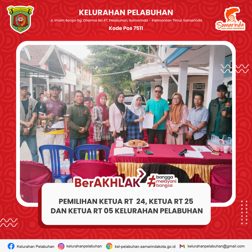 Telah dilaksanakan pemilihan Ketua RT 24, RT 05, dan RT 01 Kelurahan Pelabuhan untuk periode 2026–2031 dengan lancar dan tertib. Kegiatan ini merupakan bagian dari proses demokrasi di tingkat lingkungan yang bertujuan memperkuat partisipasi masyarakat dalam pembangunan wilayah.